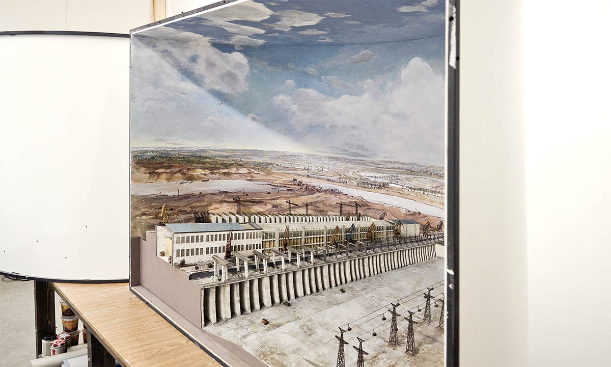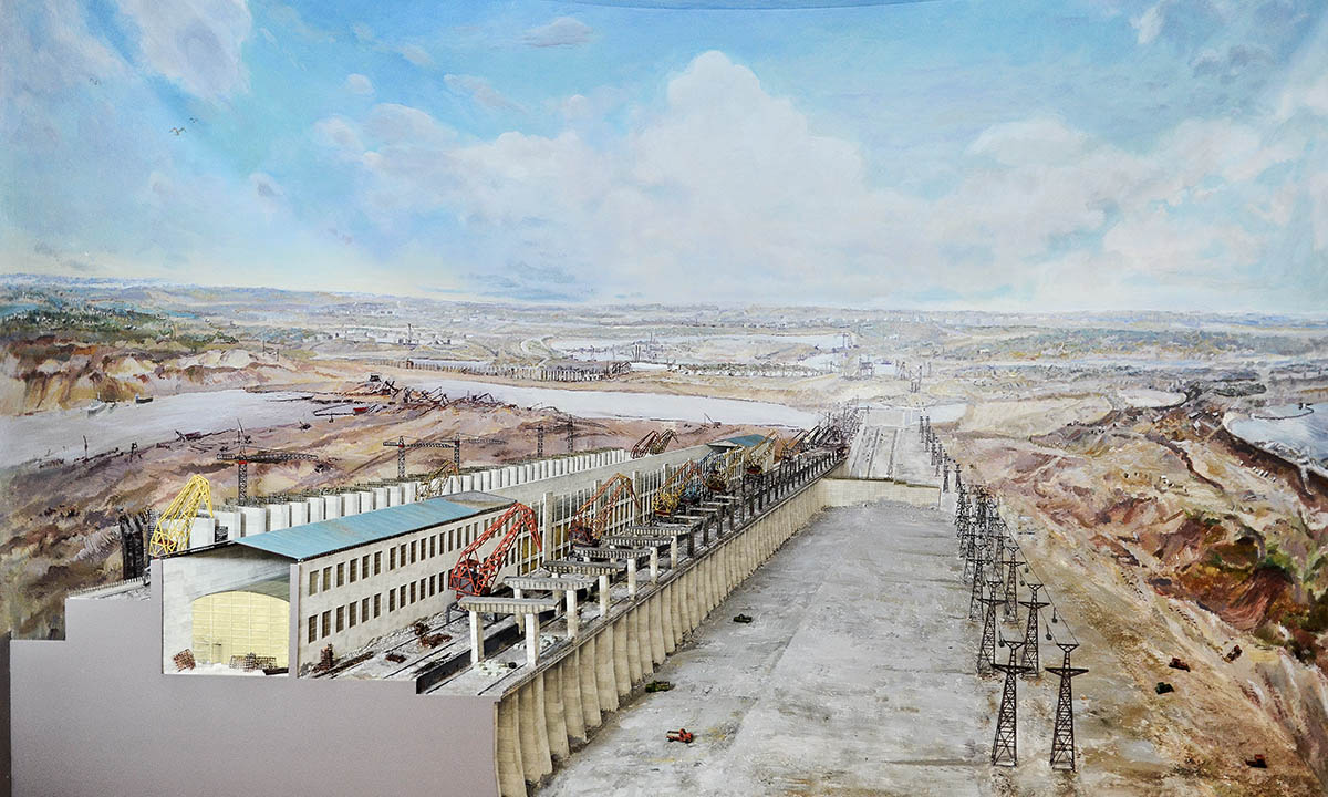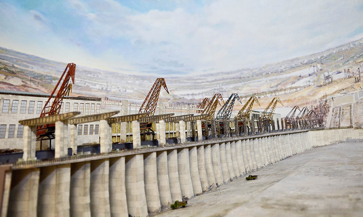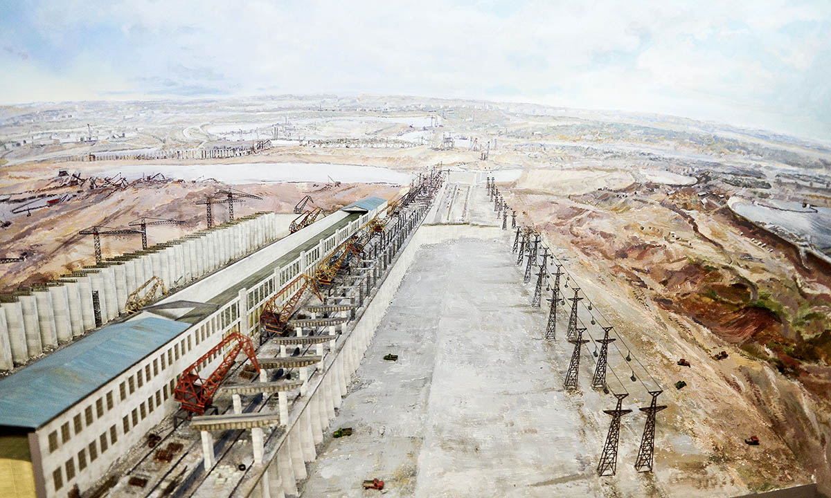 Макет-диорама показывает этапы возведения гидроэлектростанции в 1952-1961гг.