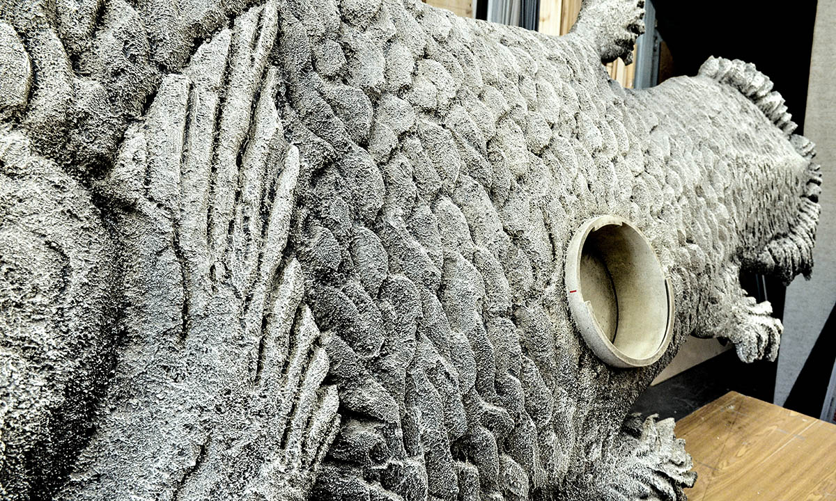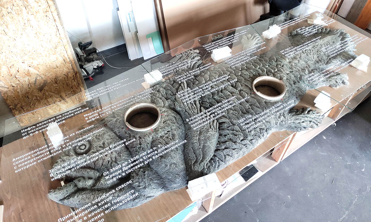 Пано закрывается стеклом с нанесенной графикой где указаны разные факты про нефть. На рыбе имеются круглые витрины для экспонатов. Длина рыбы составляет 4,5 метра.