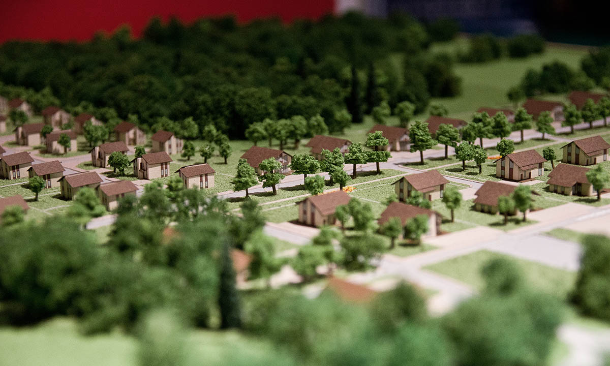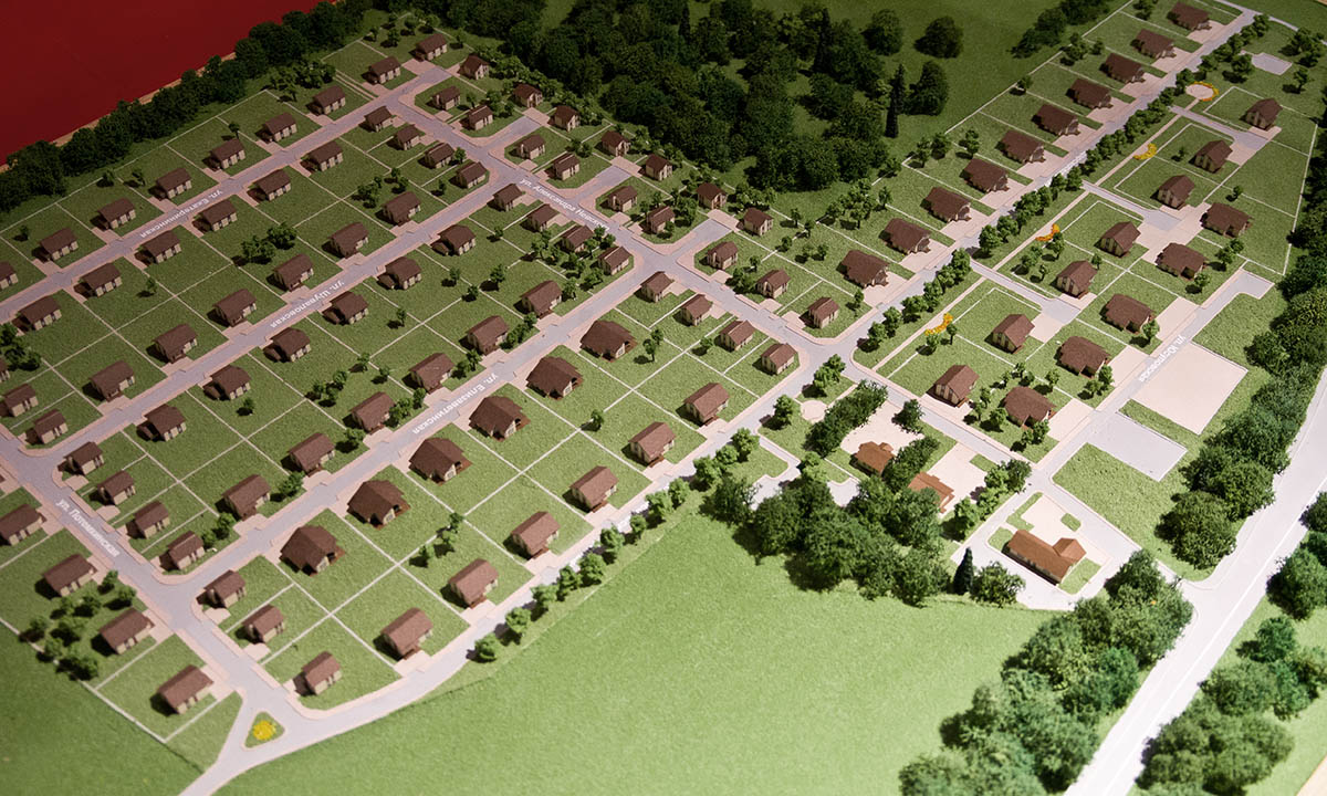 Макет демонстрирует планировочное решение с  типовыми коттеджами.