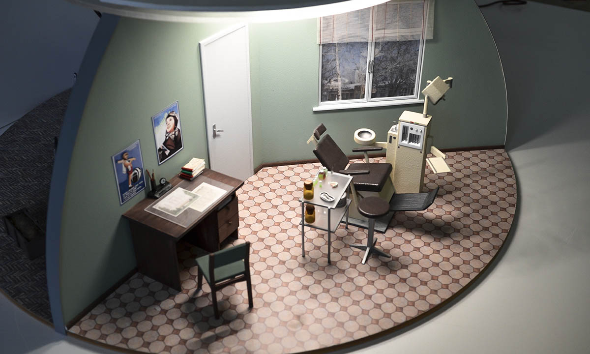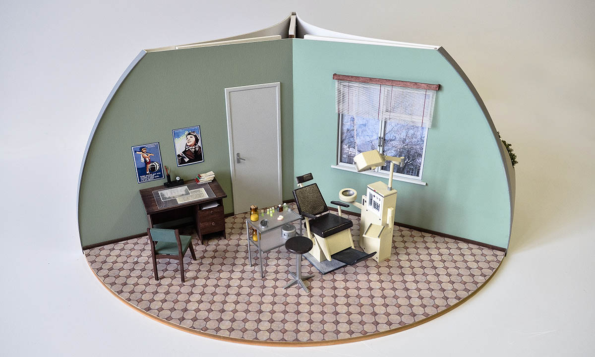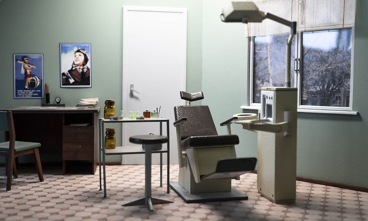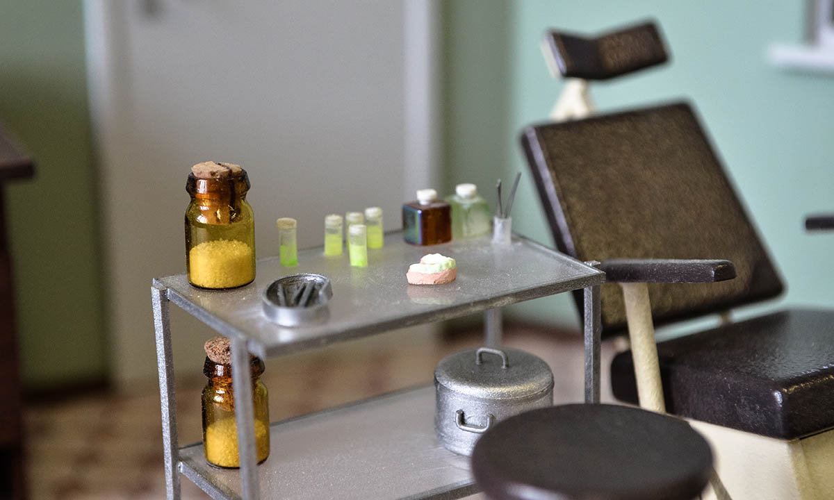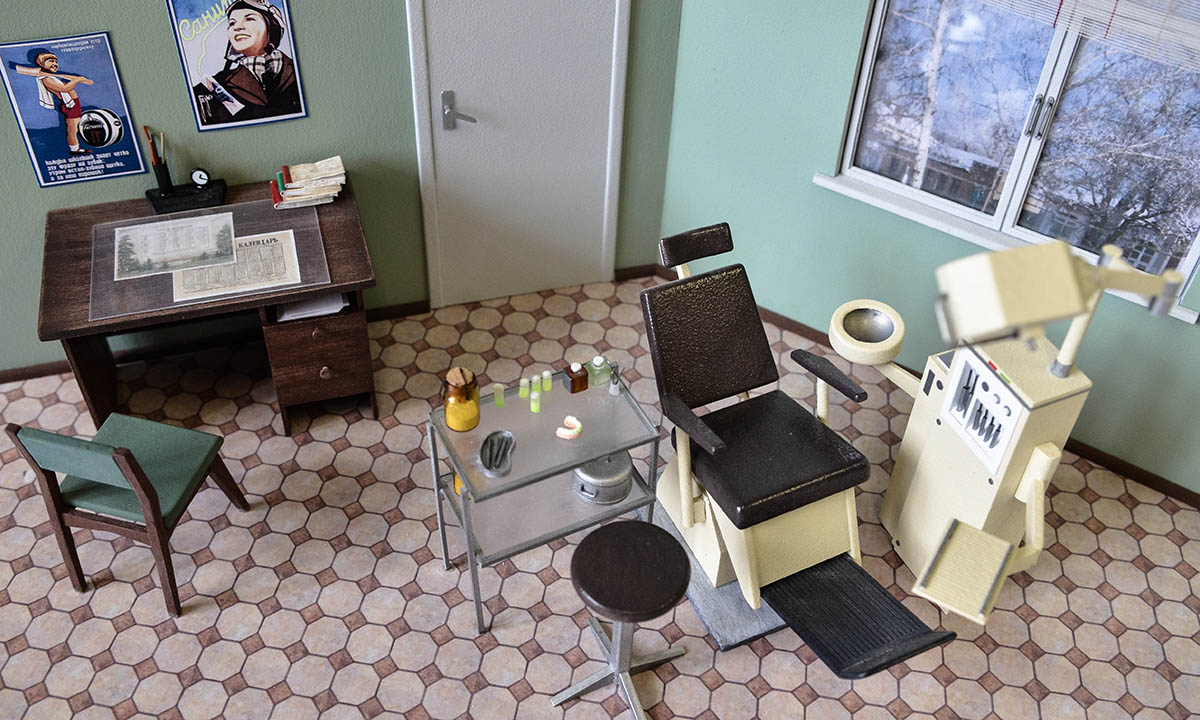 Макет показывает применение урана в стоматологии в начале и середине ХХ века.